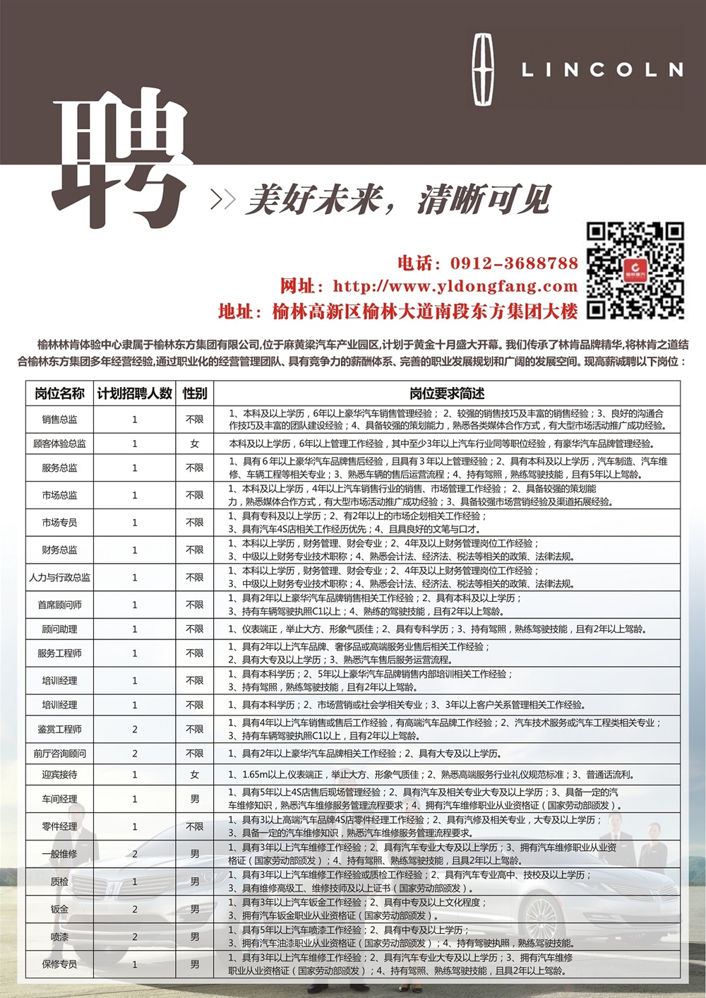 榆林林肯體驗(yàn)中心隸屬于榆林東方集團(tuán)有限公司,位于麻黃梁汽車產(chǎn)業(yè)園區(qū),計(jì)劃于黃金十月盛大開幕。我們傳承了林肯品牌精華,將林肯之道結(jié)合榆林東方集團(tuán)多年經(jīng)營經(jīng)驗(yàn),通過職業(yè)化的經(jīng)營管理團(tuán)隊(duì)、具有競爭力的薪酬體系、完善的職業(yè)發(fā)展規(guī)劃和廣闊的發(fā)展空間,F(xiàn)高薪誠聘以下崗位: