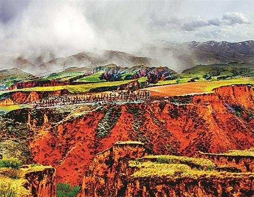 麻黃梁,歷史上曾以盛產(chǎn)“麻黃”而得名,如今作為一鎮(zhèn)之名。麻黃梁,擁有神奇而豐富的天然寶庫,黑色煤炭的豐富資源和赤色的黃土藝術(shù)資源。前者是麻黃梁經(jīng)濟基礎(chǔ)的重要支柱,后者則是獨特的西部藝術(shù)世界。兩者蘊含交匯在這塊獨特、粗獷的黃土溝壑和沙漠河源之中,實屬罕見。血脈丹青的麻黃梁,大氣、雄強,鼓蕩起黃土高原的雄性風骨,飲馬河靜中有動,閃爍著纏綿柔韌的質(zhì)樸胸懷。這塊獨具魅力的沃土,“貌似小天地,蘊含大宇宙”,應(yīng)是最有審美價值和藝術(shù)價值的黃土地質(zhì)公園。