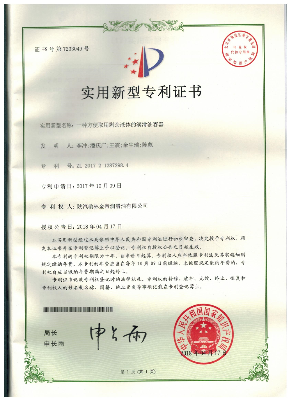 近日,榆林金帝潤滑油有限公司又獲得一項專利證書,為科技型企業(yè)、高新技術企業(yè)、科技項目申報以及對專有技術的保護奠定了基礎。