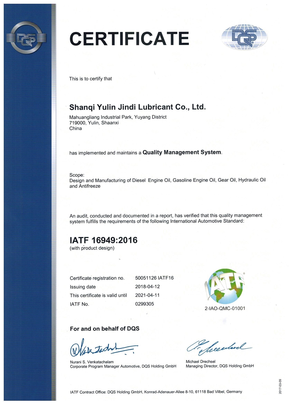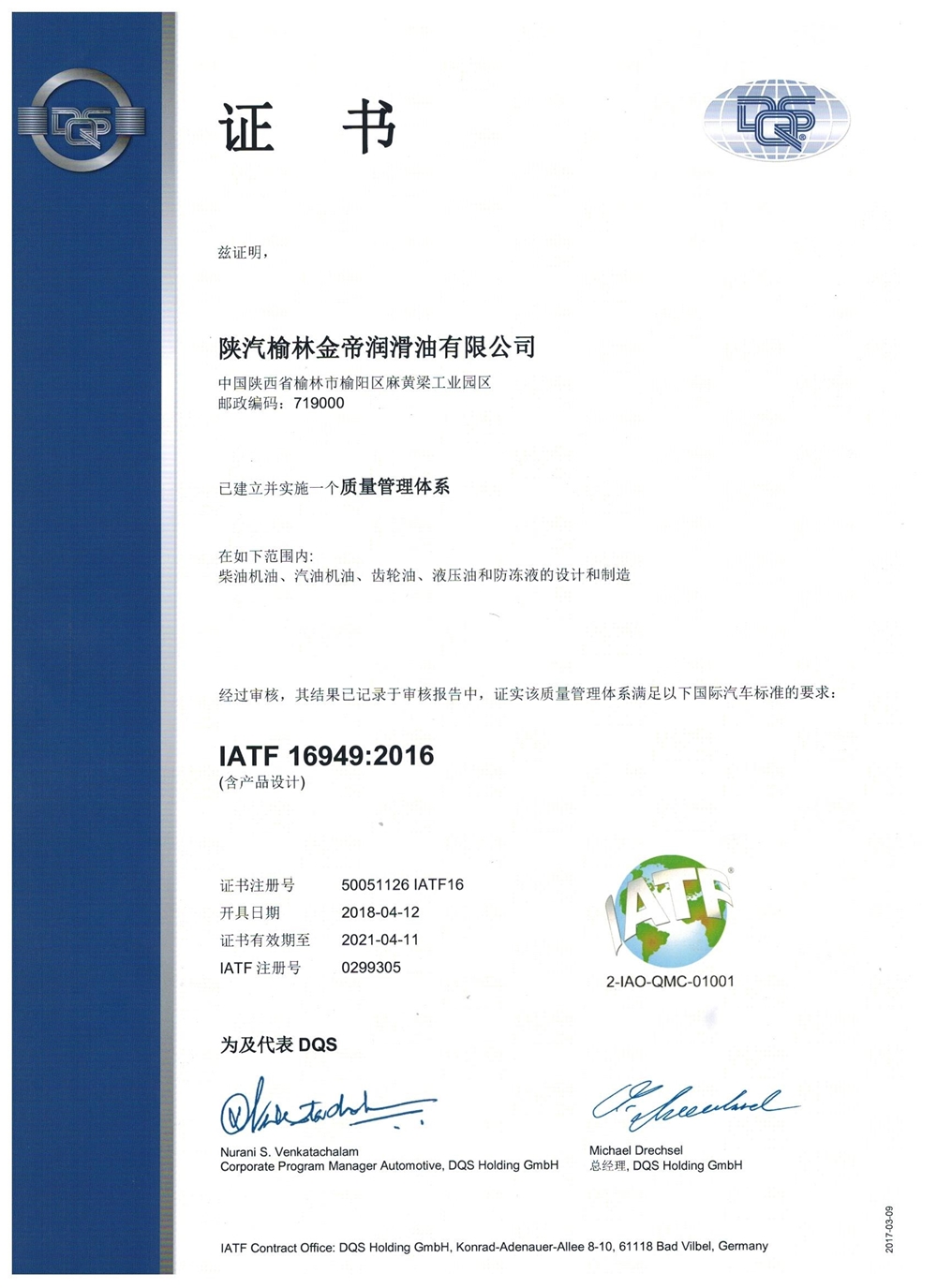 2018年5月,陜汽榆林金帝潤(rùn)滑油有限公司順利取得了由上海德世愛(ài)普認(rèn)證有限公司(DQS AP)頒發(fā)的IATF16949:2016認(rèn)證證書(shū)。